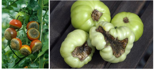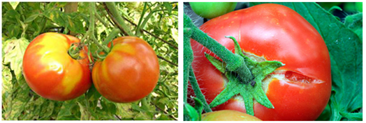 Aşağıdaki fotoğraflar ise domates topraktan yeterince potasyum ememediği zamanki görüntü. Ben bu araştırmayı yapana kadar resimdeki domatesin cinsinin böyle alacalı olduğunu sanırdım. Çatlayan domatesi ise bereketle bağdaştırırdım, yani o kadar iyi bir domates ki büyümekten çatlamış diye düşünürdüm. Halbuki topraktan potasyum çekememiş.