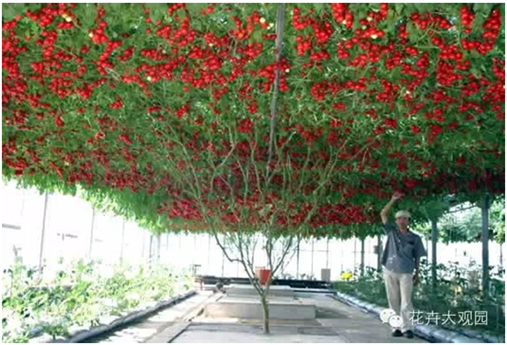 Bir fidenin 17000 domates yükünü taşıyamayacağı aşikar. Dalları desteklemek için resimdeki metal platformu kurmuş. Domates fidesi, bir ağaç gövdesi gib kalınlaşmış.